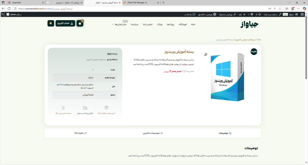 نصب قالب و حذف دکمه افزودن به سبد خرید https://wpyar.org/portfolio/install-the-template-and-remove/ اشتراک گذاری از طریق: هادی حاصلی تاریخ شروع: تاریخ پایان: ابزار: مطالعه / 2" شروع فعالیتدرخواست کارفرما:نصب قالب و حذف دکمه افزودن به سبد خرید فروشگاه که فقط قیمت نمایش داده بشود و کاربر نتواند خرید کندزمان 1ساعت کاری=1 عدد اشتراک 1ساعتهوضعیت پروژه: مشکل کامل و با موفقیت حل شد.